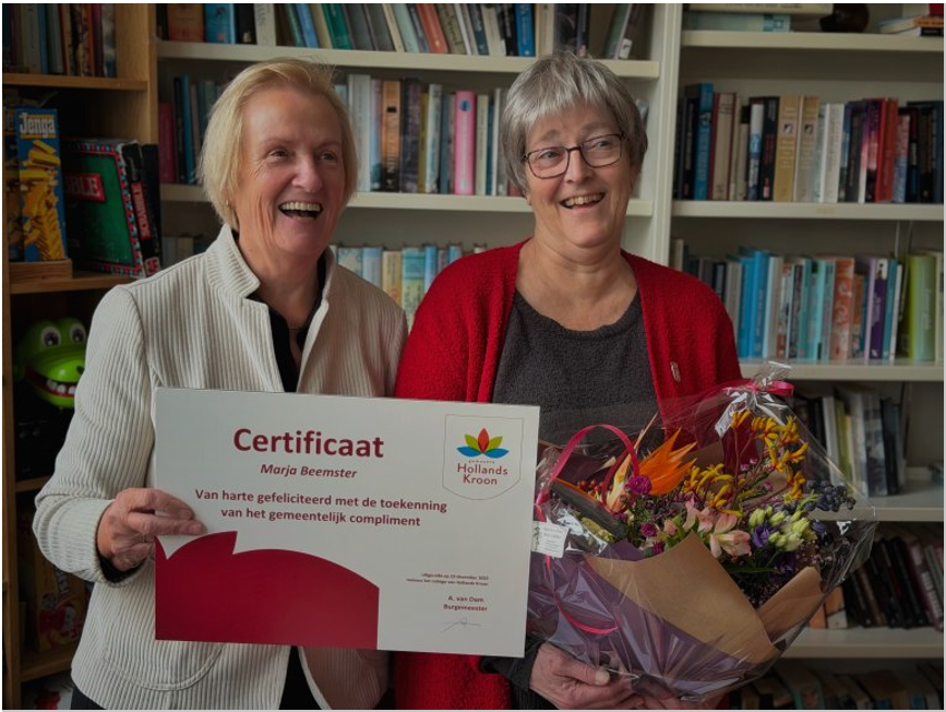Marja Beemster heeft op 19 december 2025 uit handen van wethouder Mary van Gent een gemeentelijk compliment voor haar inzet voor Cultuurhuis De Kolk. Marja is een van de oprichters van Cultuurhuis De Kolk en vanaf de oprichting voorzitter, secretaris en duizendpoot voor alles wat maar geregeld werd.